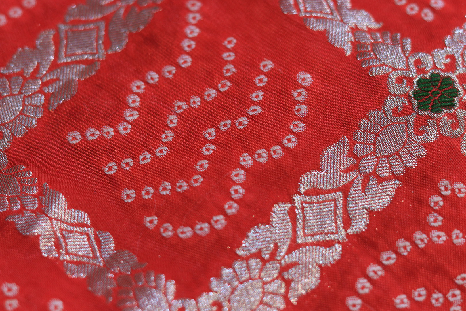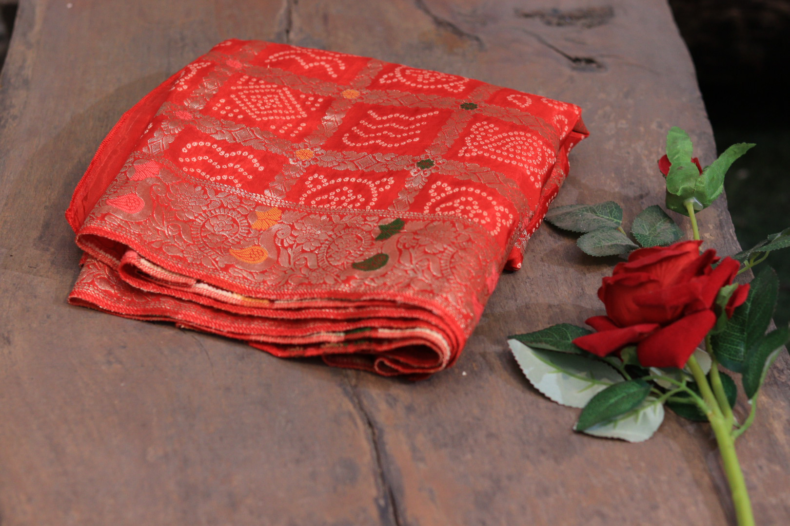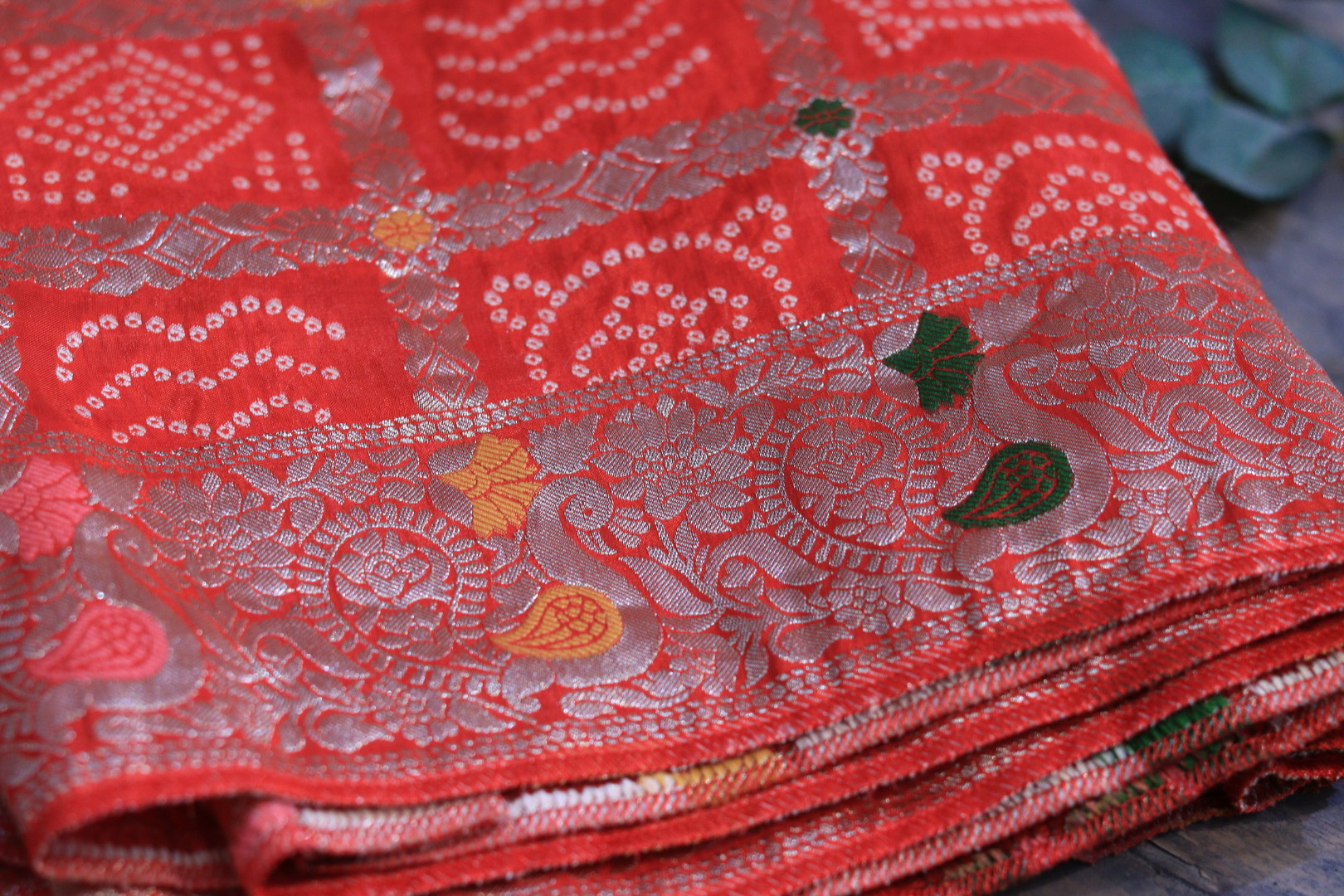 Design: Traditional Bandhej with a heavy hand-embroidered border.