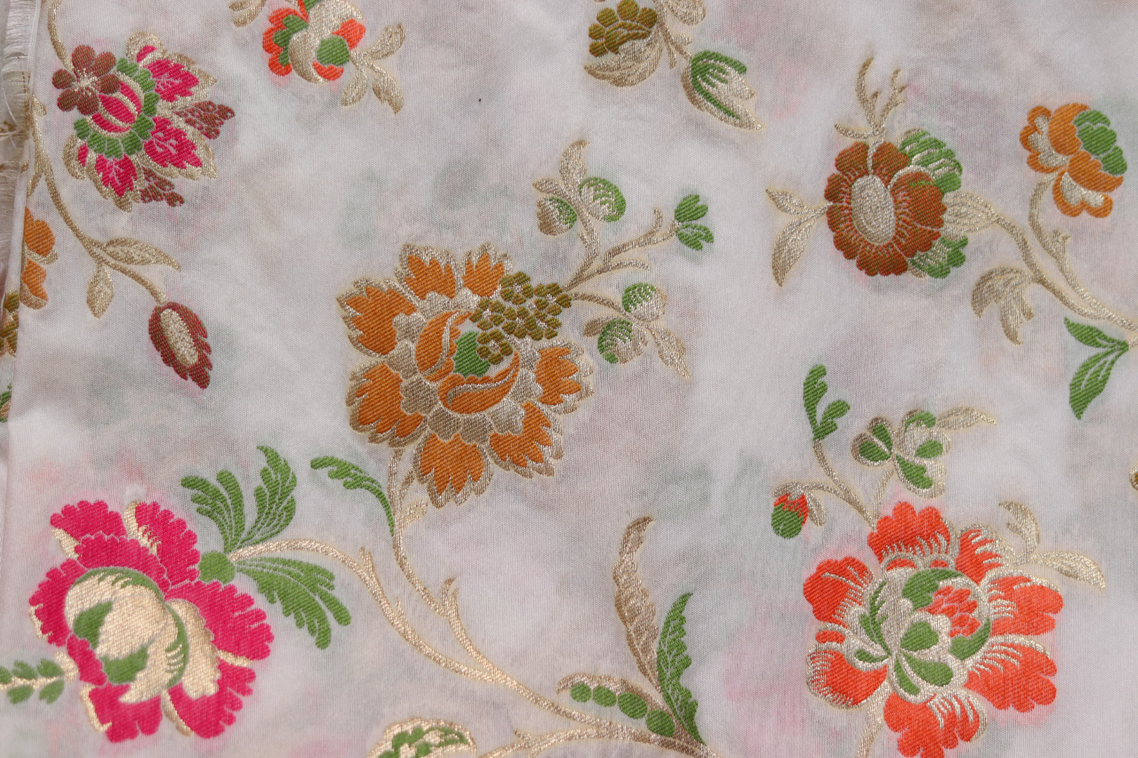 Iron on low heat from the reverse side to preserve the brocade pattern and silk sheen.