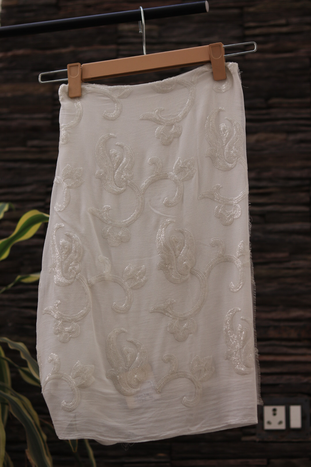 Soft and flowing georgette fabric adorned with delicate hand embroidery on a dyeable base, perfect for creating custom-colored ethnic, bridal, and festive outfits.