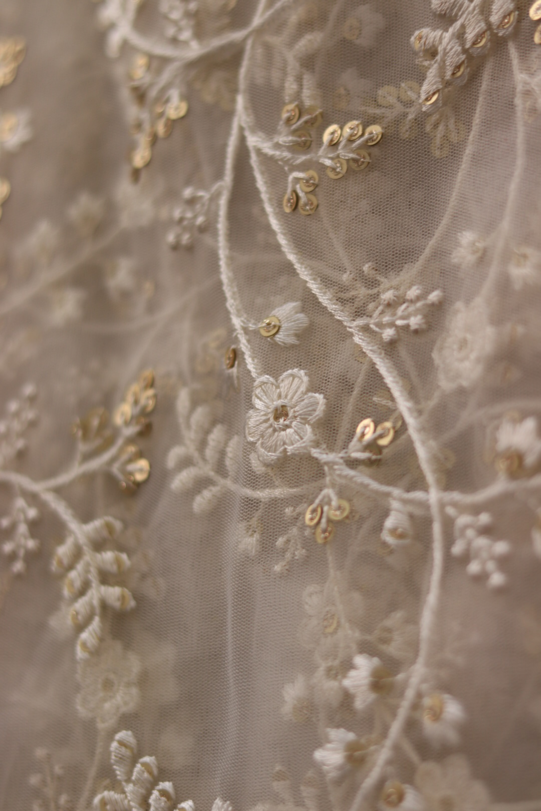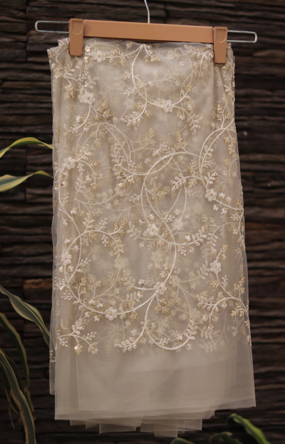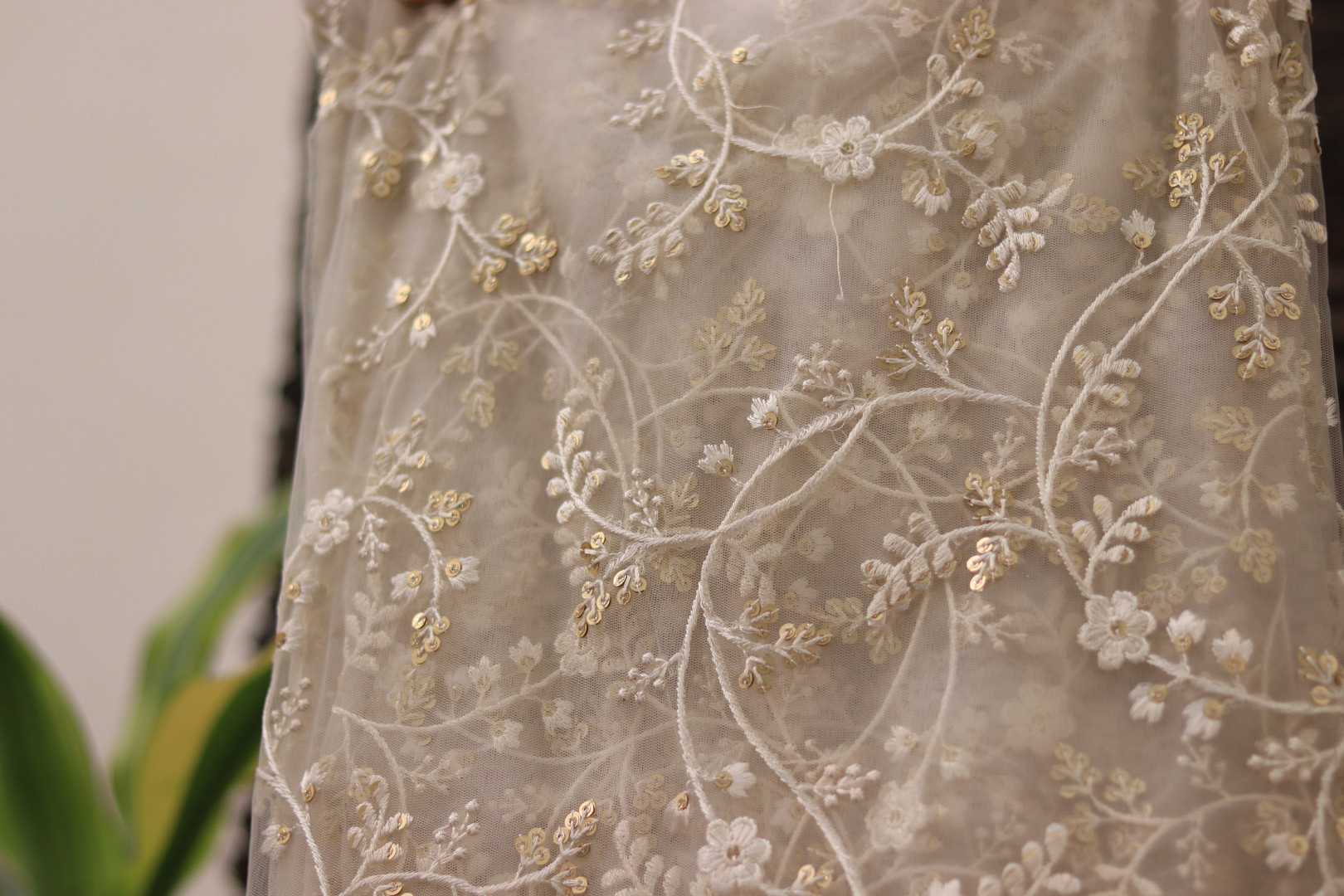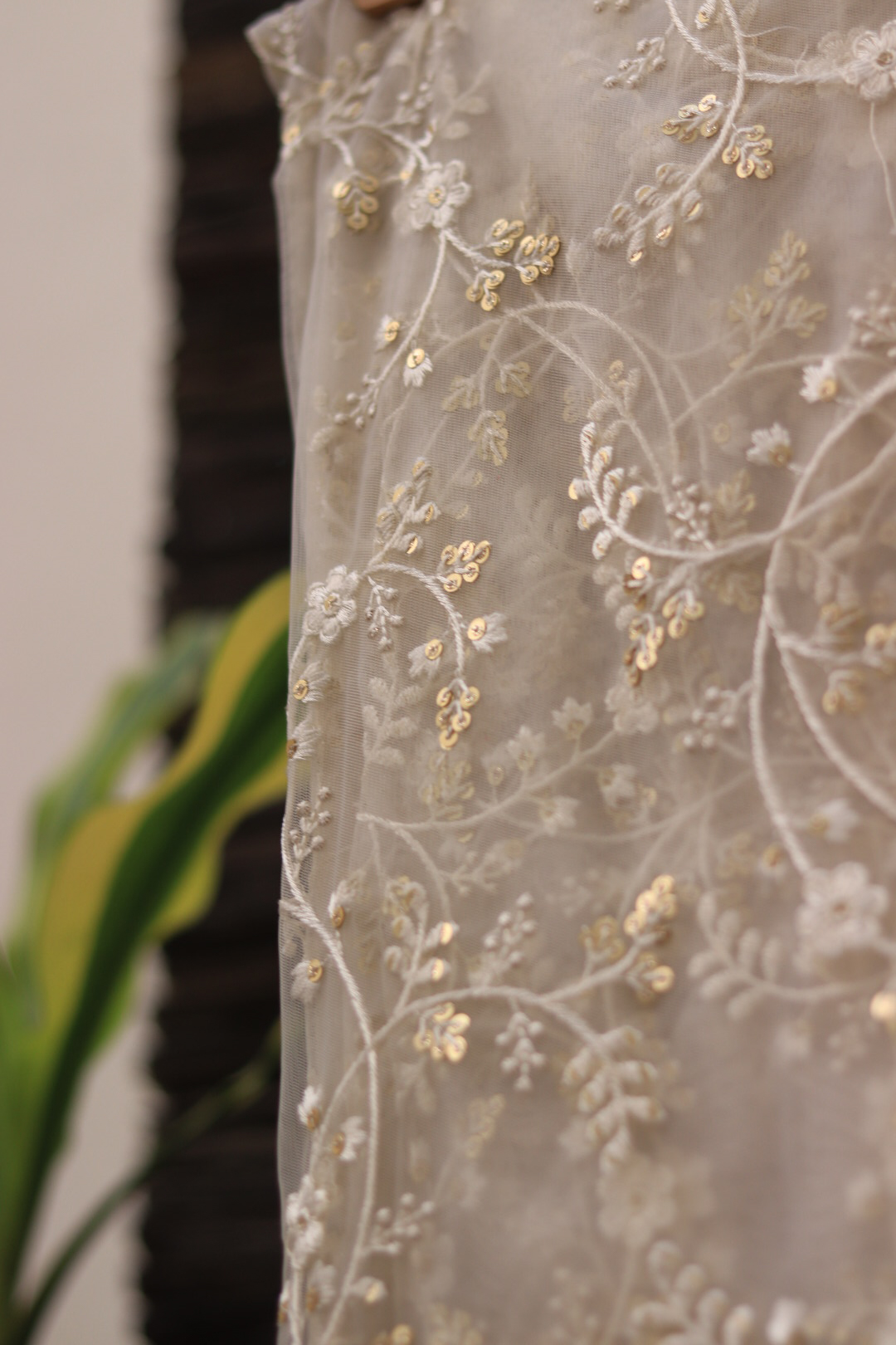 Lightweight net fabric adorned with delicate hand embroidery on a dyeable base, perfect for creating elegant and customized ethnic, bridal and designer outfits.