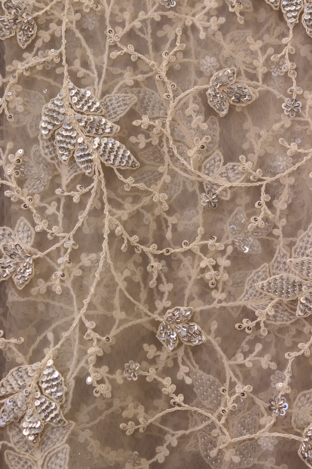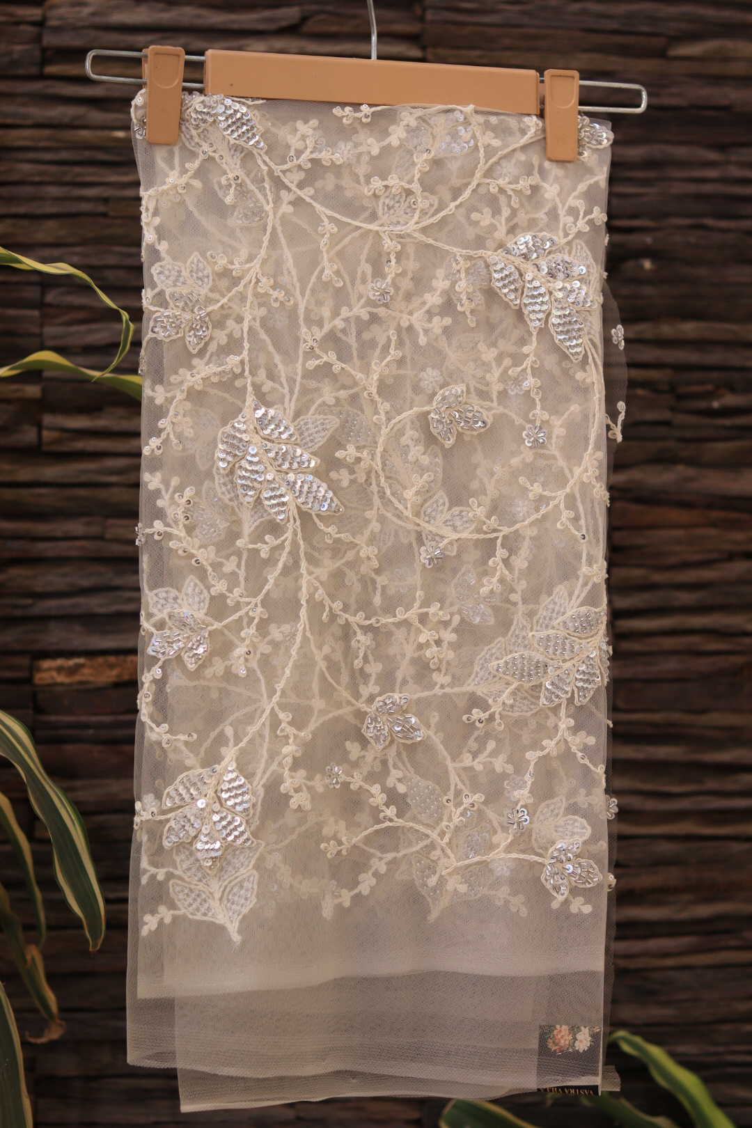 A soft and sheer net fabric adorned with intricate hand embroidery on a dyeable base, perfect for creating custom-colored festive, bridal, or designer outfits with a graceful and elegant look.