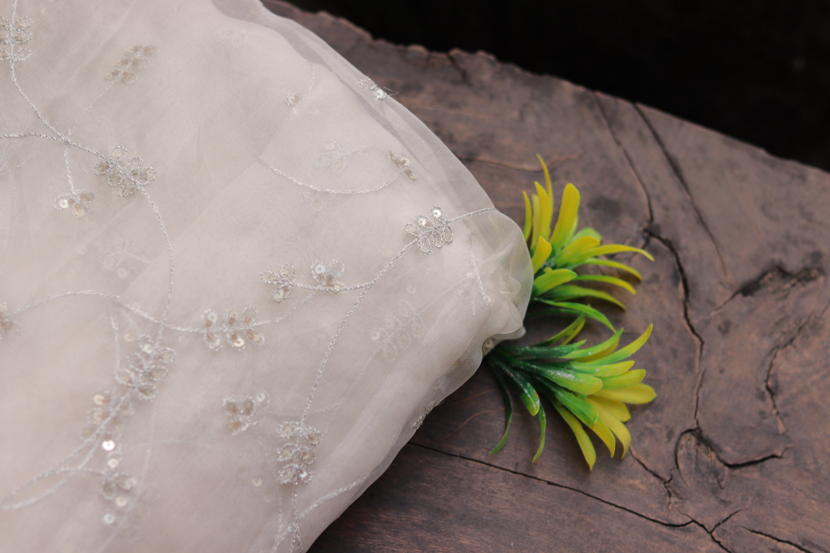 Delicate net fabric adorned with elegant hand embroidery, offering a dyeable base perfect for custom-colored designer creations and luxury ethnic wear.