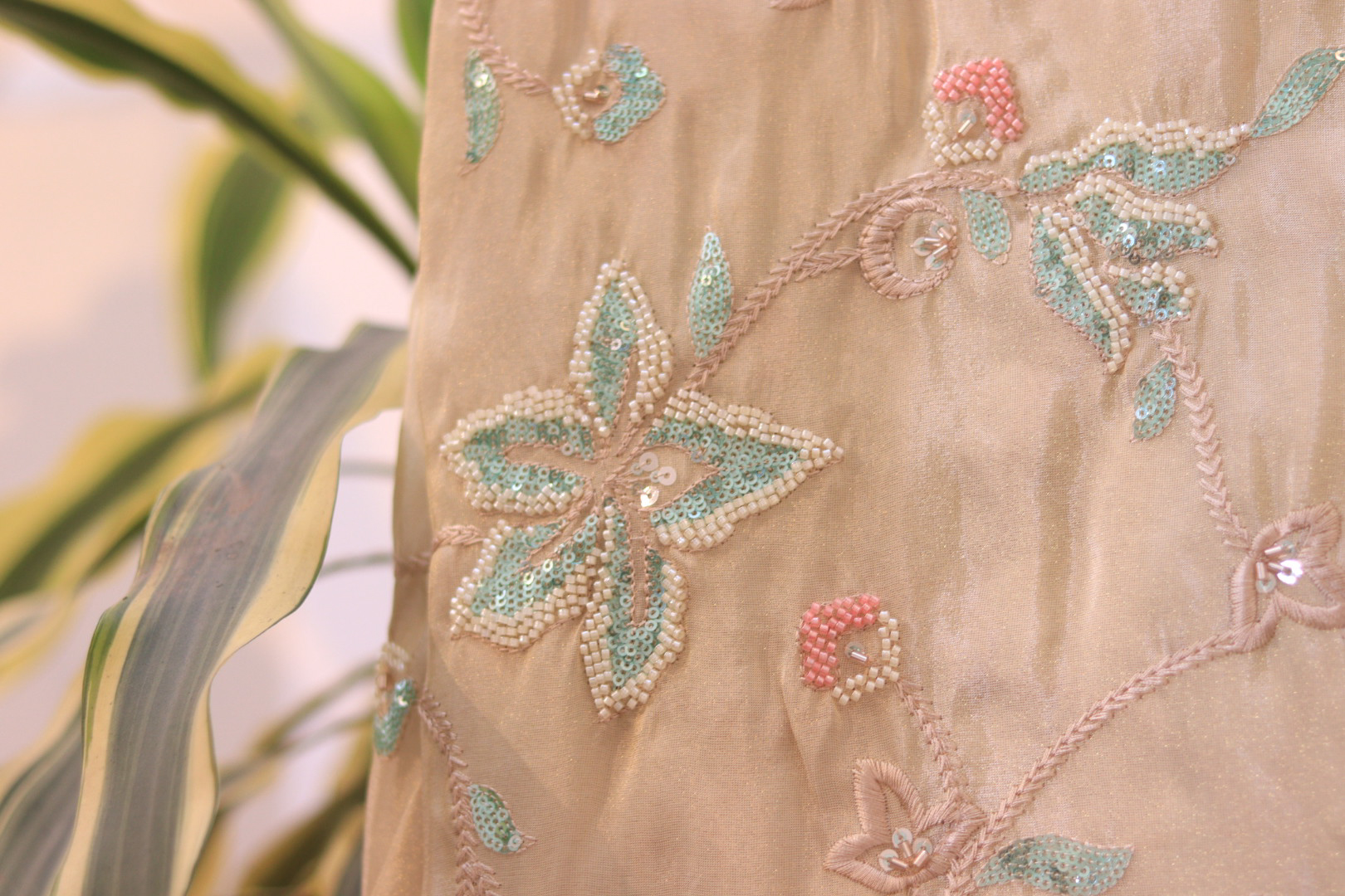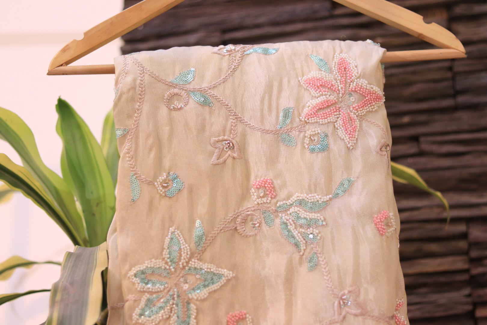 Luxurious tissue fabric enhanced with fine hand embroidery, featuring a dyeable base that lets you customize the color for elegant festive and bridal creations.