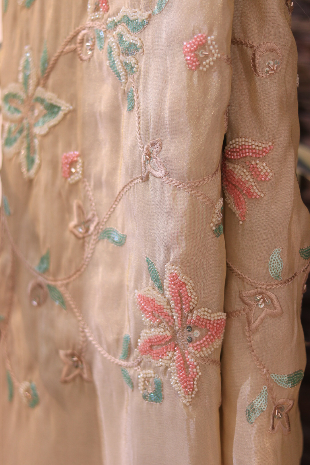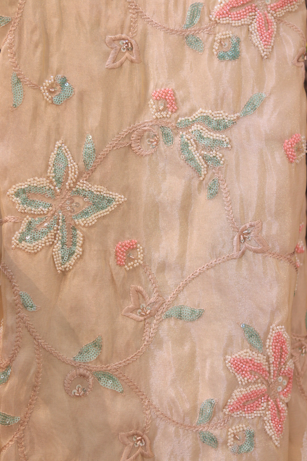 Elevate your designer wardrobe with this Dyeable Hand Embroidered Tissue Fabric, an exquisite blend of shimmer, texture, and artistry. Crafted from premium tissue, the fabric exudes a subtle sheen that beautifully complements the delicate hand embroidery work.