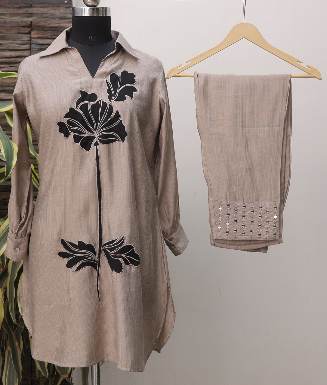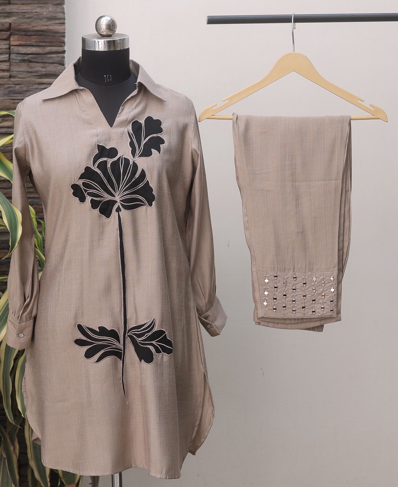 Elegant Faun Silk Co-ord Set featuring patchwork on the top and embroidered silk bottoms. Crafted in soft silk for a luxurious feel — perfect for festive events, parties, or refined everyday wear.