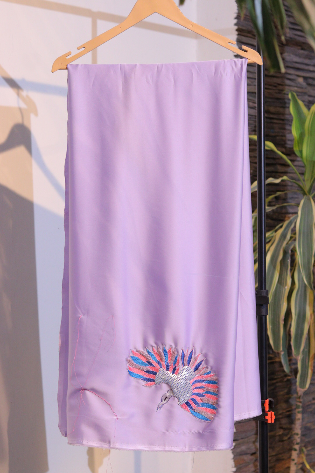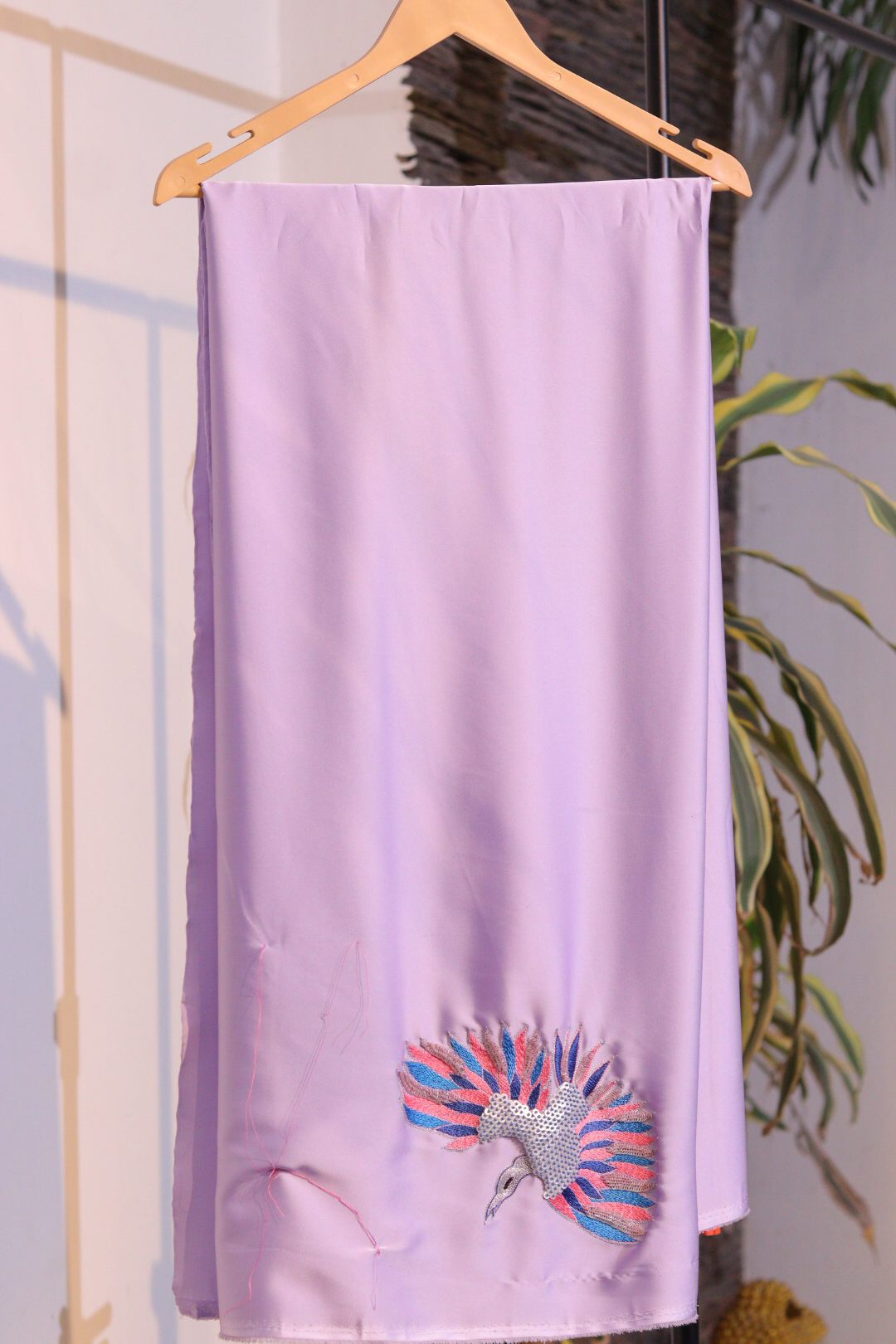 Luxurious Lavender Armani fabric with delicate hand embroidery. Perfect for stitching elegant dresses, tops, or ethnic wear.
