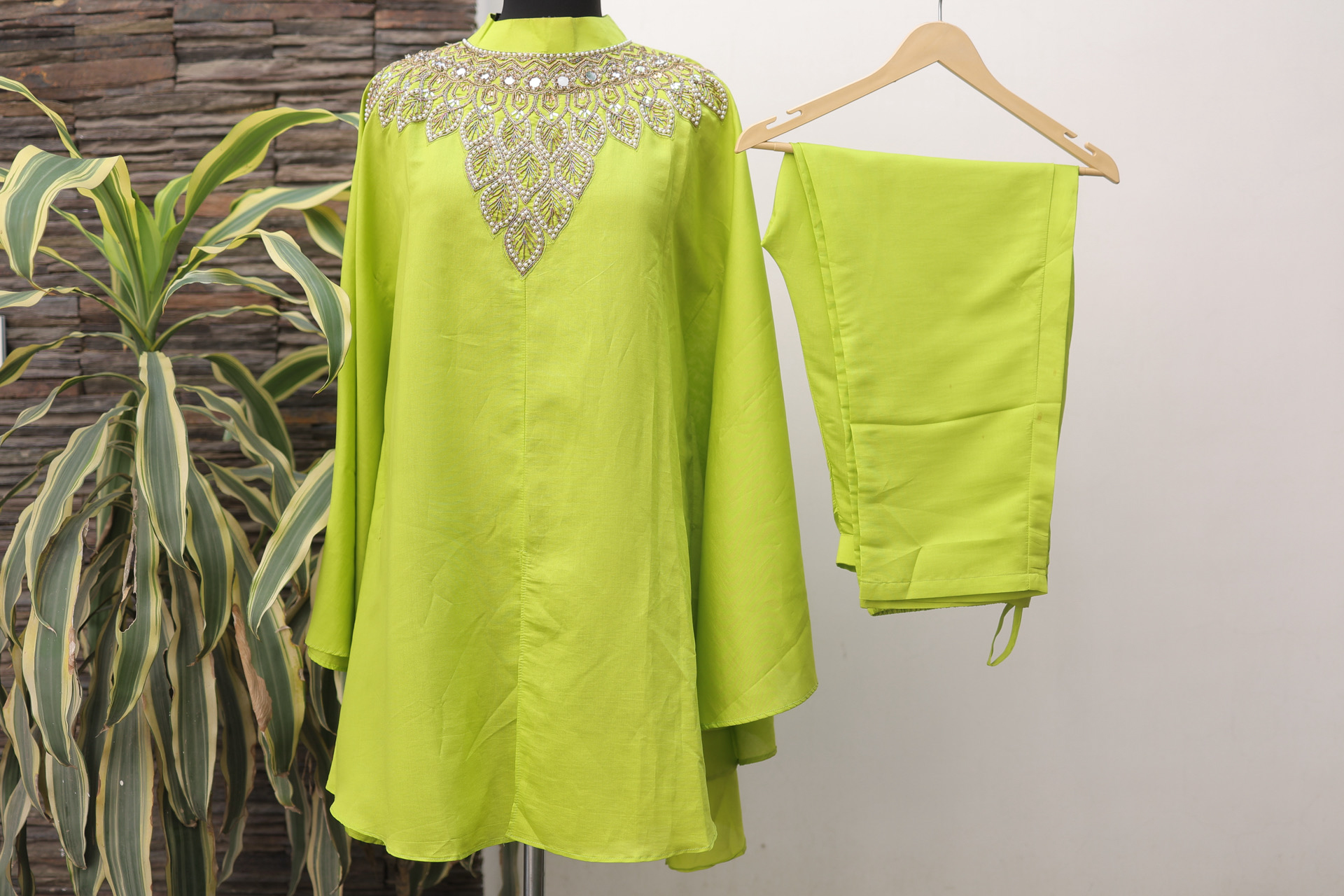 Step into effortless elegance with this Parrot Green Hand-Embroidered Kaftan Pattern Co-ord Set. Crafted from premium cotton silk, the top and bottom feature delicate hand embroidery, giving a refined and artisanal touch. The lightweight and soft fabric ensures comfort while maintaining a sophisticated silhouette, making it ideal for festive gatherings, evening events, or stylish daytime wear.