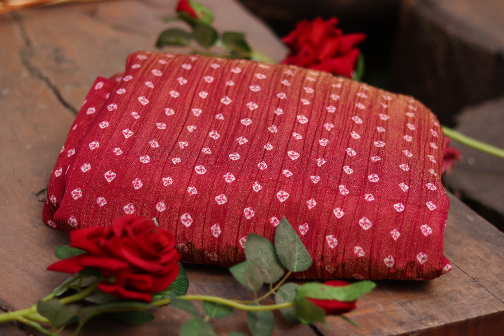 A soft and lightweight crush tissue fabric in pink, featuring traditional Bandhej patterns. Flowing, elegant, and perfect for festive or ethnic outfits.