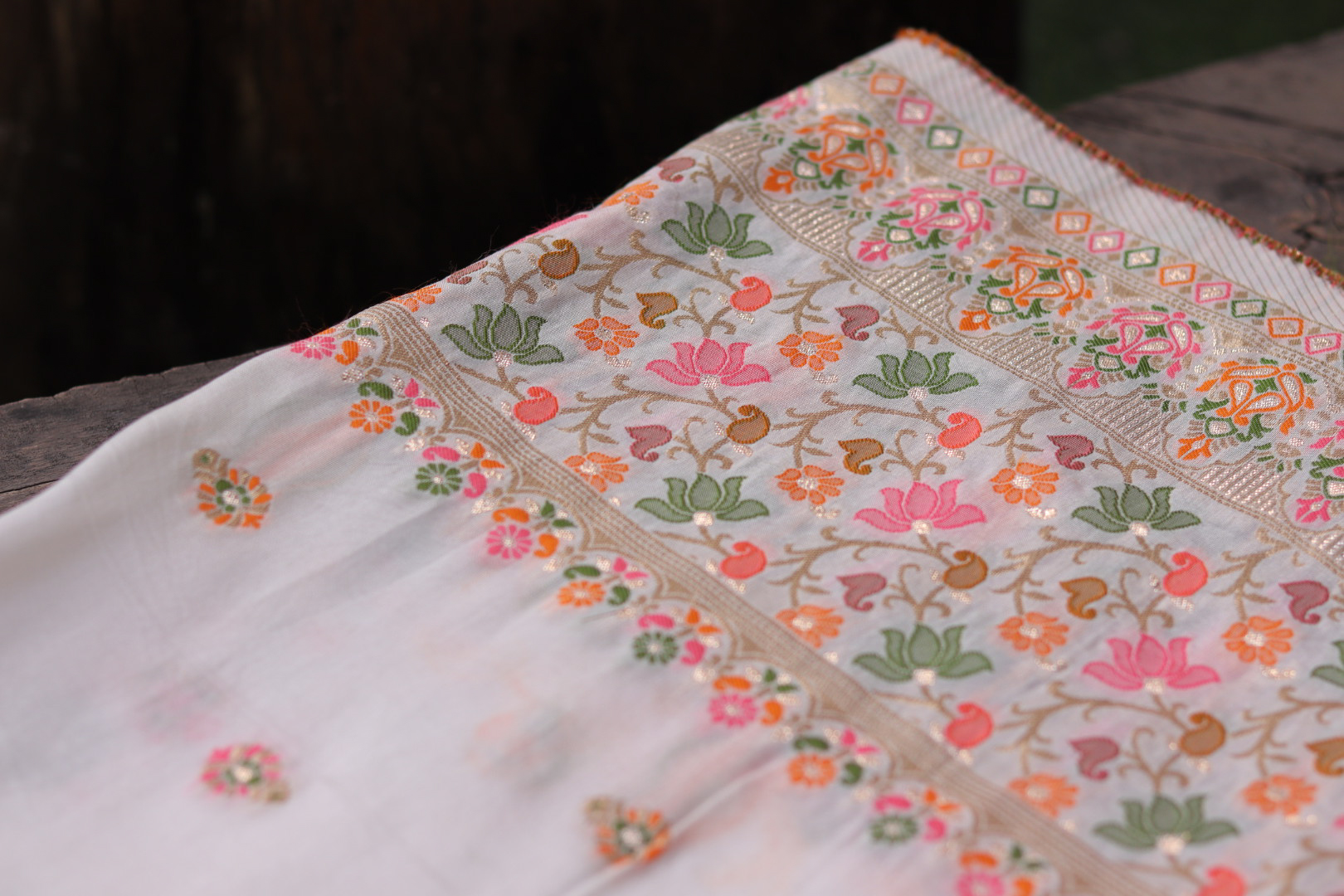 Elegant Pure Silk Dupatta with delicate embroidery on a dyeable base — perfect for creating personalized shades. Soft, luxurious, and ideal for festive or designer wear.