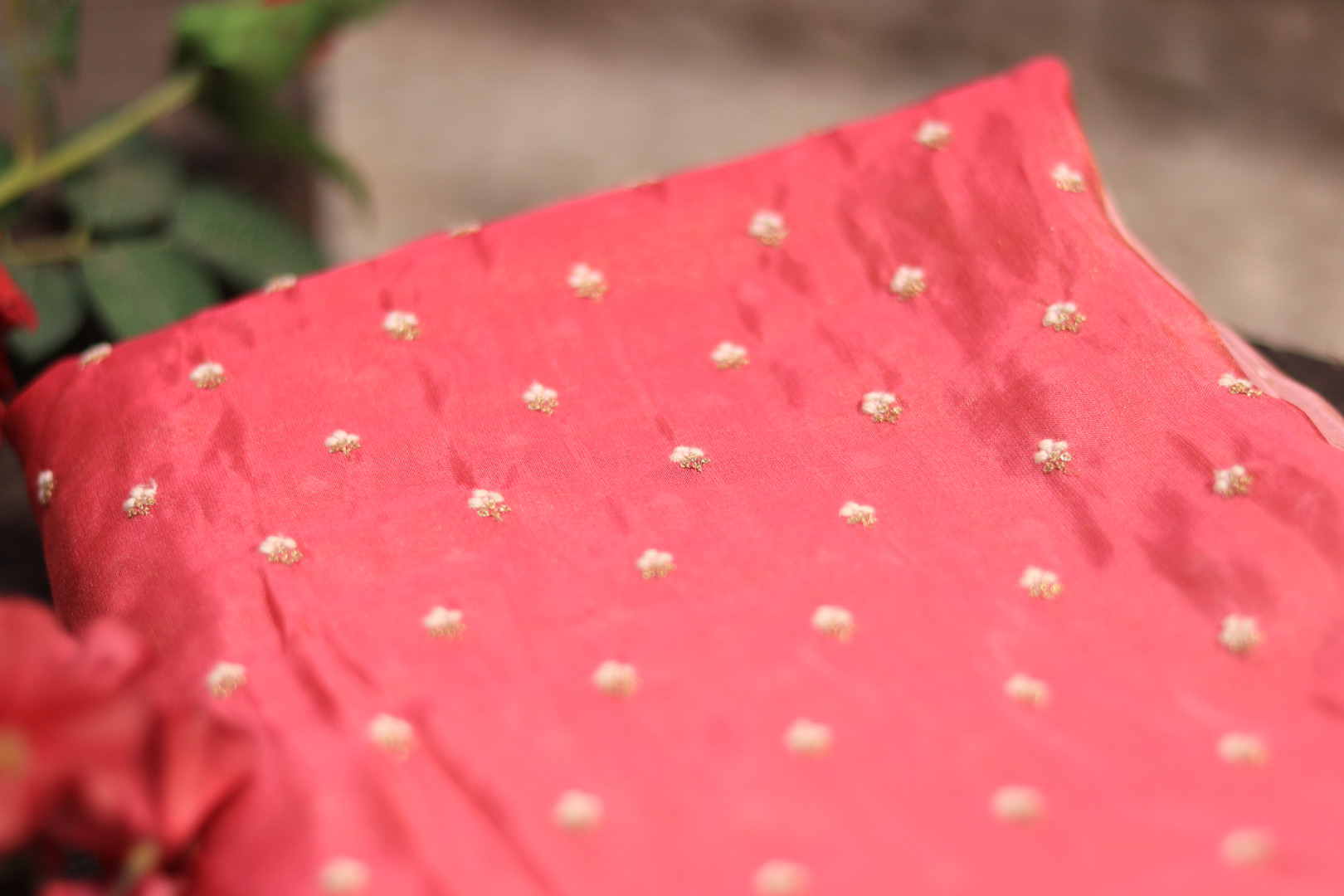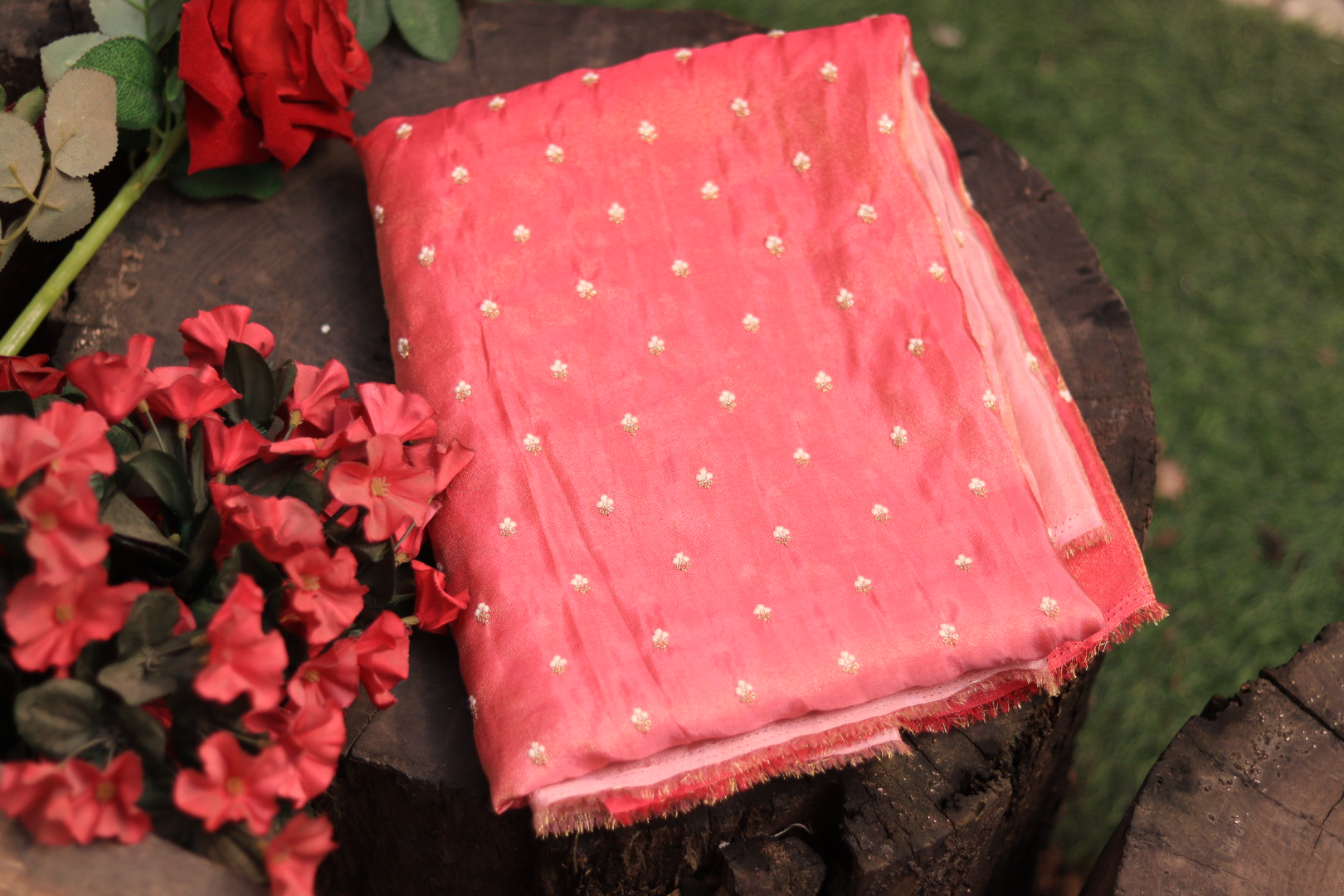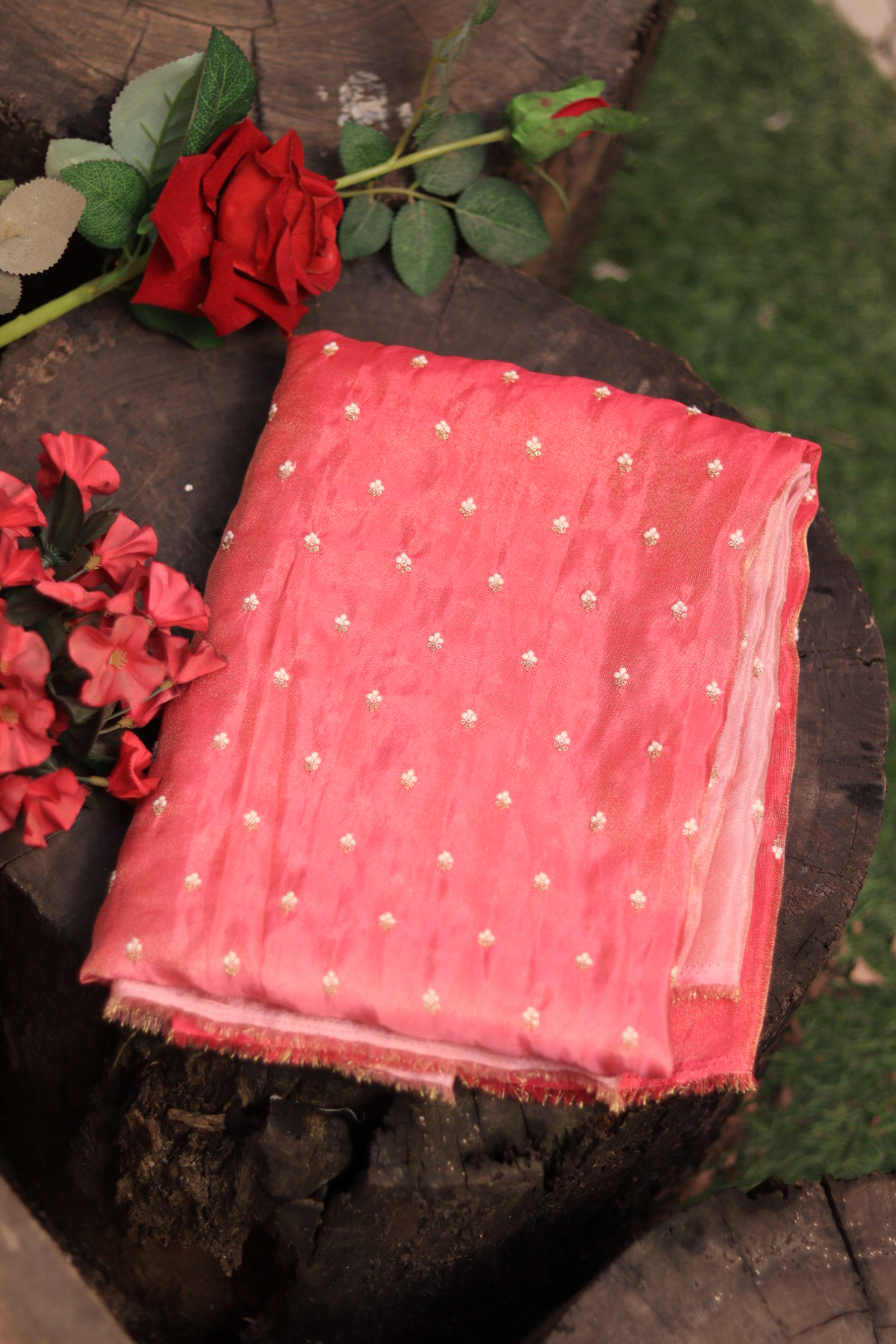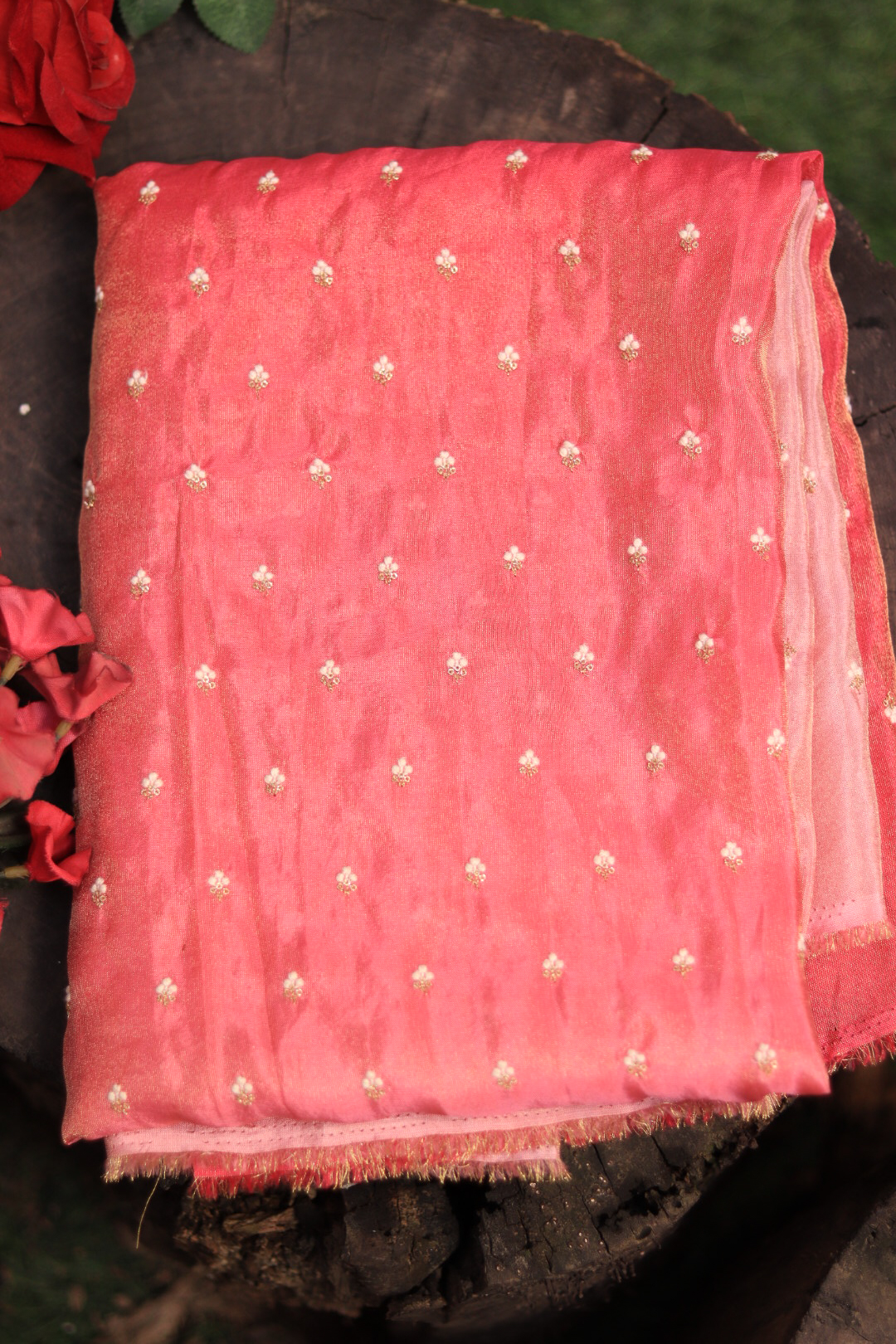 A lightweight tissue fabric in shades of pink featuring delicate hand embroidery. Flowing, elegant, and perfect for creating festive, ethnic, or designer outfits.