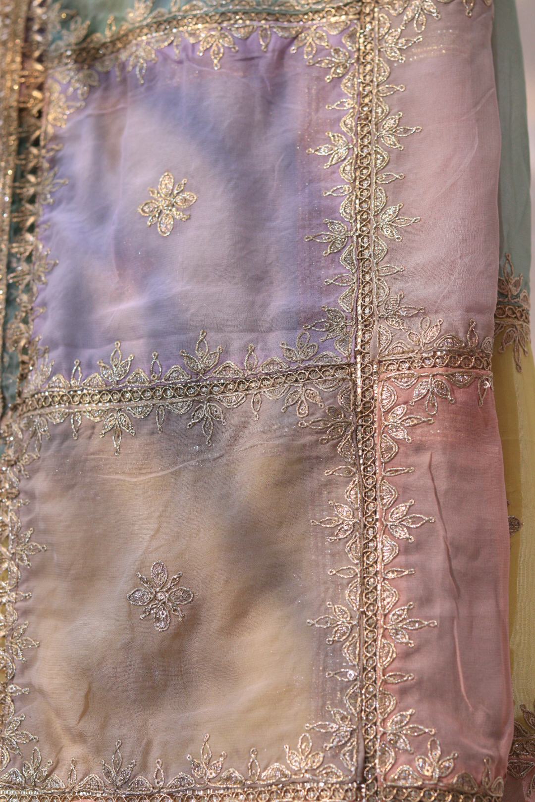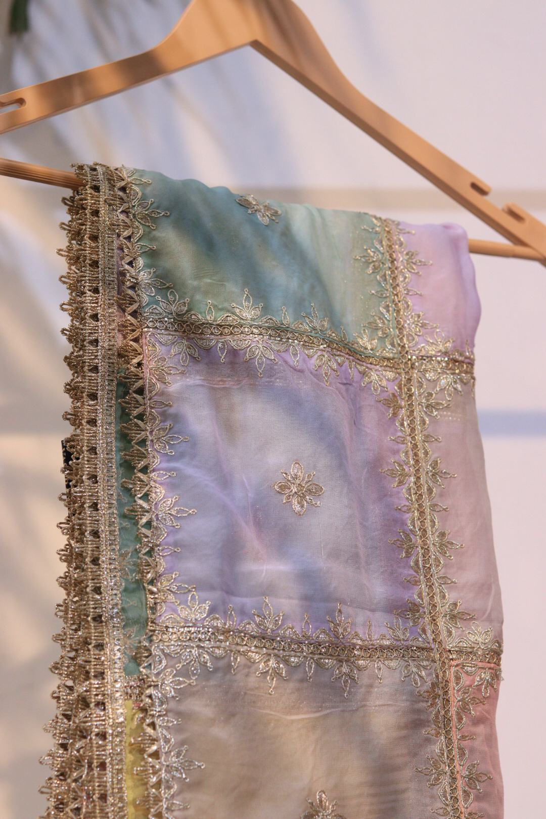 A luxurious tissue dupatta adorned with beautiful multicolor hand embroidery in soft pastel tones. Lightweight, shimmery, and perfect for festive or wedding wear.